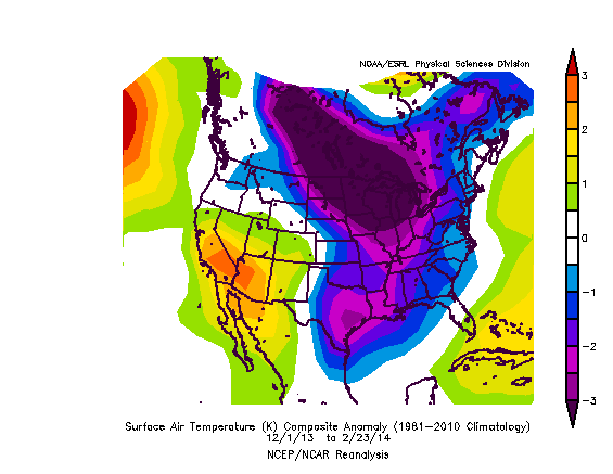 The below map shows how this winter (beginning December 1) compares to a normal winter from the past 30 years. It has been a cold winter. Obviously.