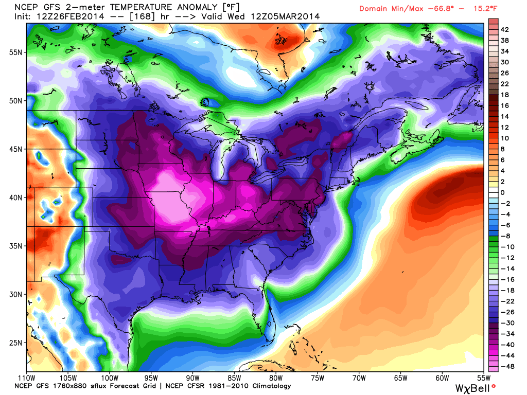 No cold relief in sight. This map compares next week’s temps with what we would normally see for the first week of March: