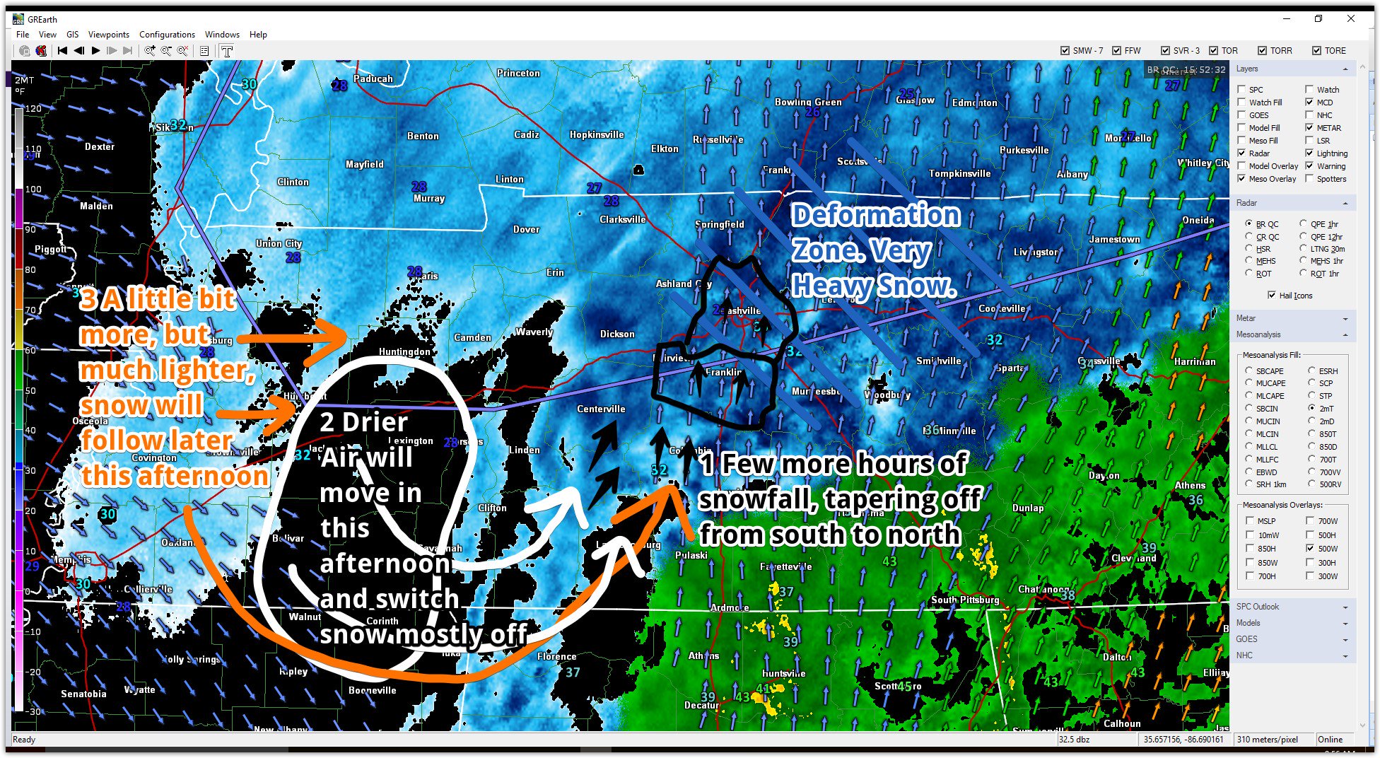 The fabled Deformation Zone was setting up along and N of I-40 into Davidson County, where, in about 5 hours, we got an entire season’s worth of snowfall.