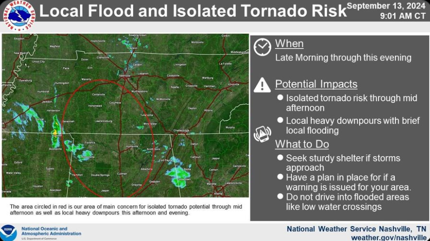NWS Nashville has highlighted an area of concern for a local flood and isolated tornado risk which includes most of WillCo. This does not mean Nashville and Davidson Co. are in the clear, but the main area of focus will be inside the red circle.