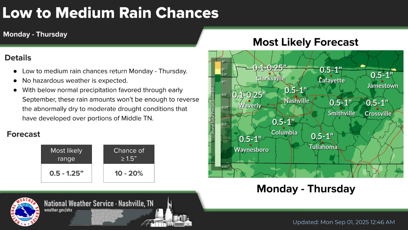 Still not expecting any severe weather, but again there could be enough instability (storm fuel) for a few thunderstorms. Rainfall totals from Monday – Thursday generally in the 0.5 – 1″ range – not expecting any flooding issues.