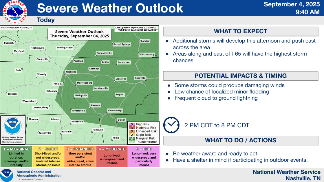 The Storm Prediction Center has outlooked most of our two counties with a 5% chance of damaging straight-line winds within 25 miles today. Tornadoes are not expected.