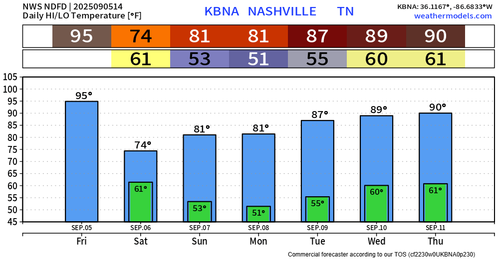 The good news is that cooler and drier temps will follow the rain. Temps warm back up by the middle of next week, but dewpoints will stay in the 50s – so somewhat tolerable.