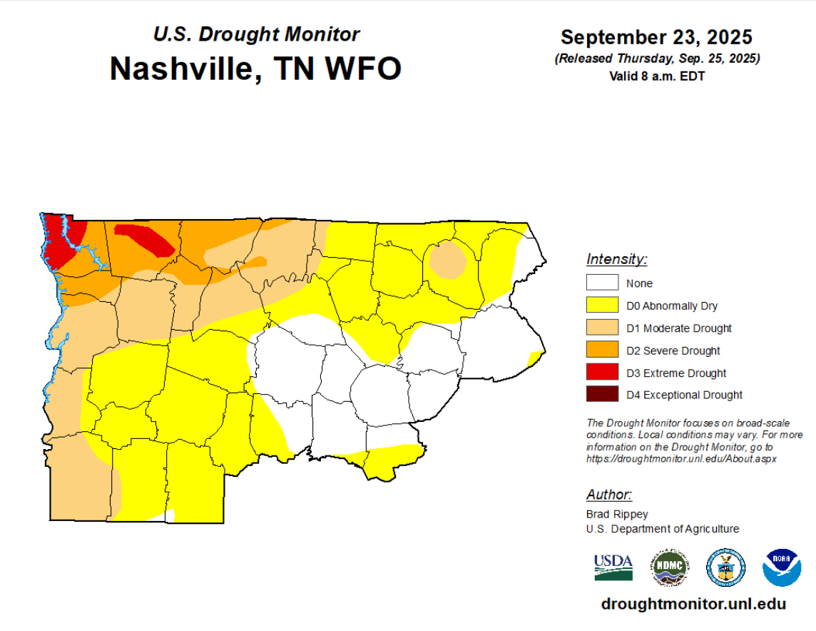 Some slight improvement in WillCo. – most of Davidson still under a Moderate Drought. This only includes rainfall we’ve received up to Tuesday, so none of the rain we saw yesterday is taken into account.