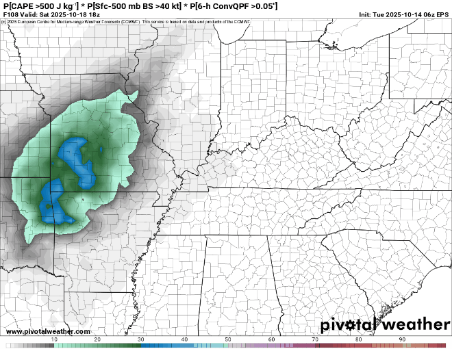 I don’t believe I’ve ever showed this model parameter before, but I think it’s a useful one. I’ll use the Euro ensemble, but the GFS thinks the same thing. Below is the probability that sufficient CAPE (storm fuel), sufficient shear, and rain will be exist at the same time at a given area. I probably didn’t explain that very well.