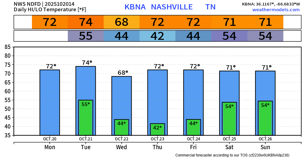 BNA bottomed out at 42° this morning, which to my knowledge (don’t quote me on this) is the coolest we’ve been so far this Fall.