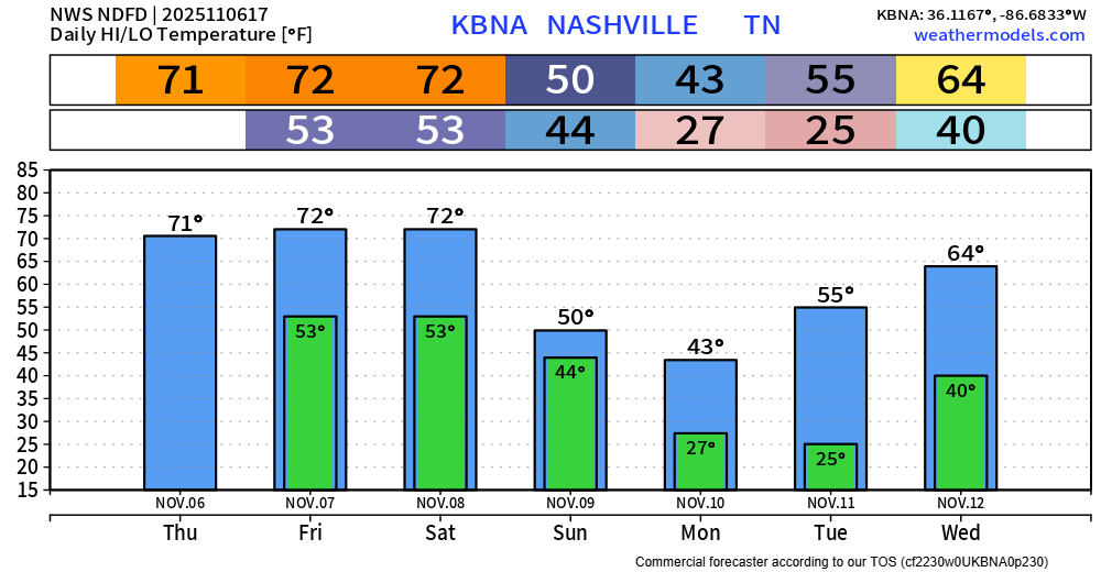 On Sunday, it’s likely our high temperature occurs right around midnight. As the cold front moves thru, our winds will start to come from the NW bringing in much colder and drier air.