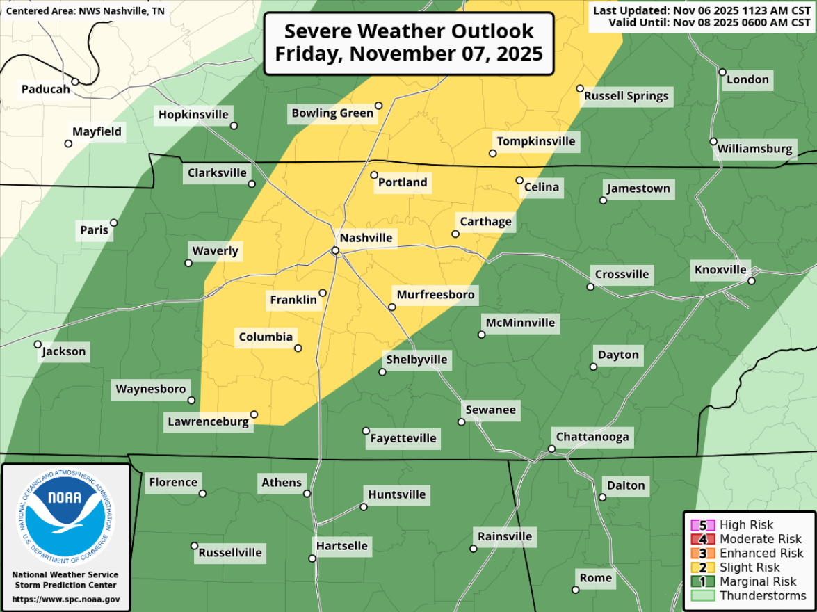 “Ahead of this front, a warm, moist airmass will yield around 500 J/kg of CAPE primarily across the western half of Middle TN. This will allow for showers and thunderstorms to develop late morning before becoming more numerous in the afternoon and early evening hours. There`s still a lot of uncertainty regarding tomorrow`s severe weather risk as some parameters still aren`t favorable. While there`s plenty of wind shear with bulk shear values exceeding 50 knots, forcing looks to be weak with the shortwave too far north and the front`s arrival too late.” – NWS Nashville Area Forecast Discussion
