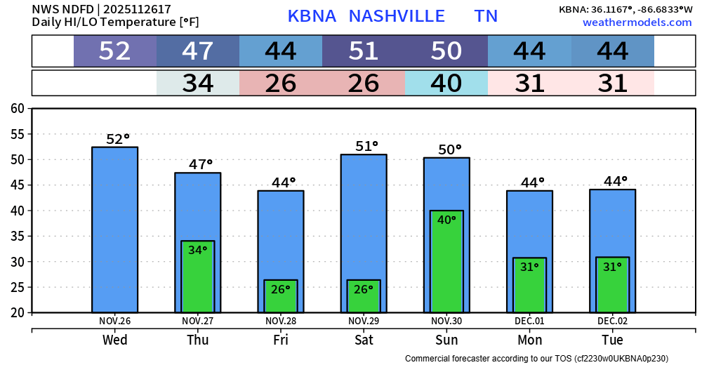 “Something else to watch closely will be the potential for wintry precipitation. Models have trended cooler next week, and depending on timing of precipitation, this could have implications on what type of precipitation we get. At this point, don`t think it`s anything to get too worried [or excited] about.” – NWS Nashville