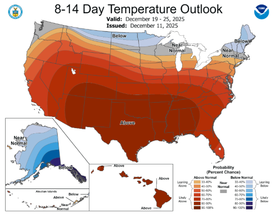 These warmer than average temperatures will continue thru Christmas. For those dreaming of a White Christmas, sorry.