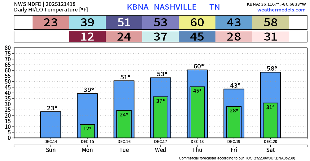 The “official” low tonight is 12° but that’s Nashville, most everyone outside of Downtown will easily reach single digits. Several layers will certainly be needed as you head out the door Monday morning. Our Cold Weather Advisory continues thru noon Monday. Continue to be mindful of the 4 P’s: People, Pipes, Pets, and Plants.