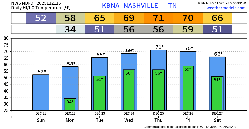 Highs will continue to climb over the next couple of days, getting all the way near 70° Christmas Eve thru Friday. Not record highs, but we’ll be ~20° above average.