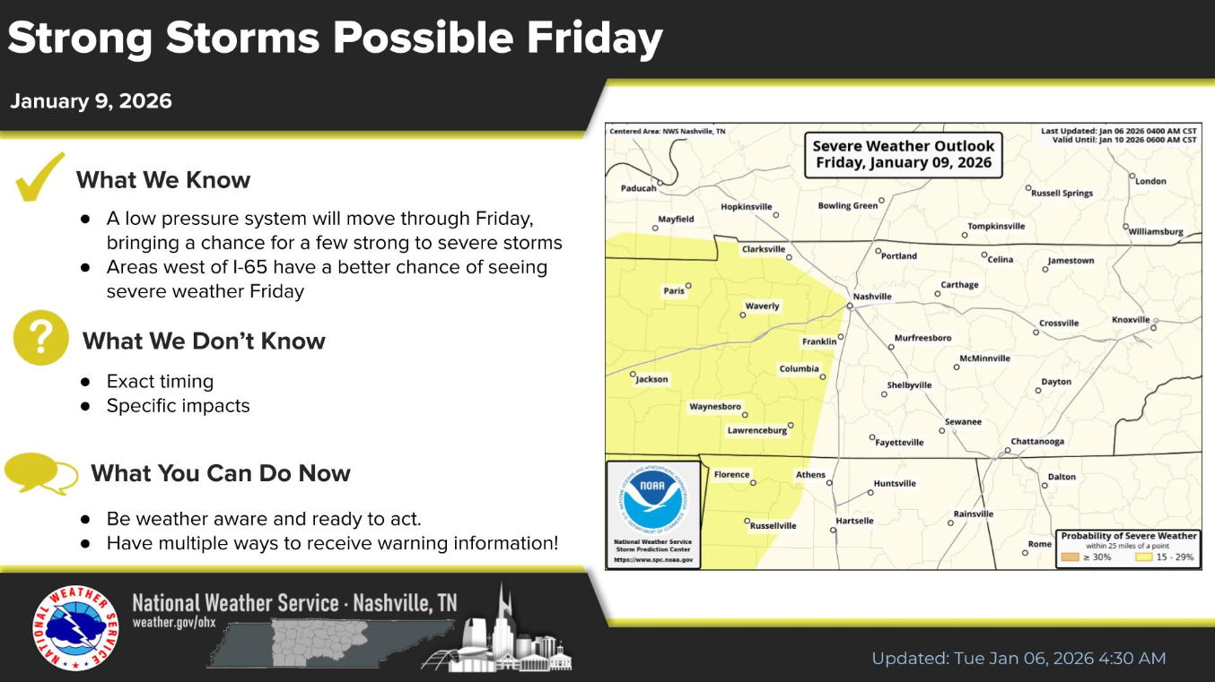 The Storm Prediction Center continues to have the western portions of Davidson and Williamson counties outlooked with a 15% chance of severe weather within 25 miles. This appears to be a Friday afternoon/evening threat.