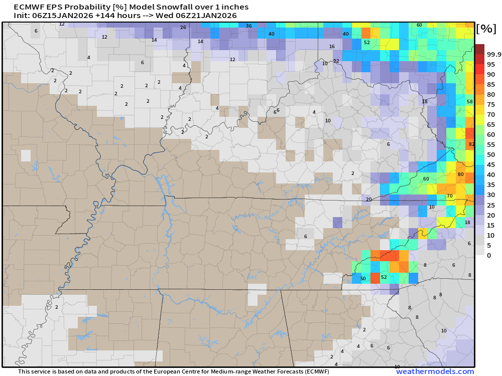 Lots of stuff flying around social media about some snow chances in the SE towards the beginning of next week. Here, our chances are next to none. The Euro ensemble thinks our chances of seeing 1″ or more of snow thru Wednesday morning is 0%.