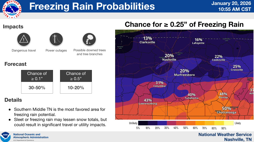 Most models are pretty set on thinking this will be all snow for us. There are a couple runs of some different models that think we could see some freezing rain mixing in towards the end of this event. At this time, it seems like the highest probability for freezing rain stays to our south (see graphic below). Most of the time, freezing rain is more impactful than snow, so no thank you. This is something we will absolutely be watching.