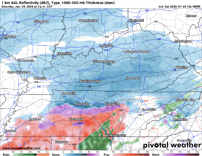 The latest HRRR model gives a guess, looping from 3p today to 5p Sunday – to be used as guidance, not gospel. Timestamp in upper left.