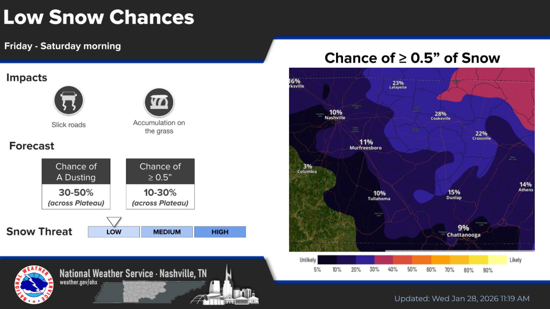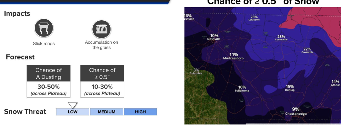 For now, chances of 0.5″ or more of snow are only around 10% for us. Higher for folks to our east on the Plateau.