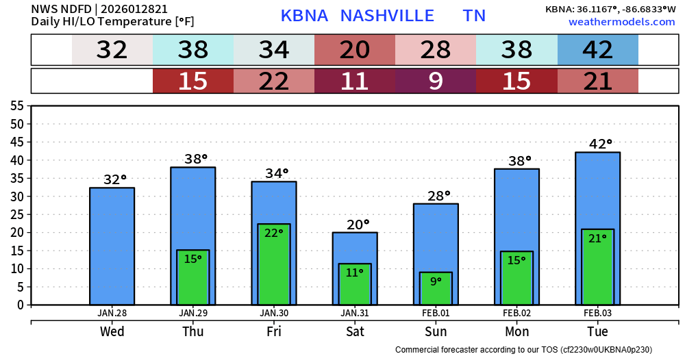 We finally got above freezing as we made it to 33° at BNA at the 3p observation. This, paired with sun has helped the melting process some. Additional melting will happen on Thursday, as most of us get into the upper 30s.