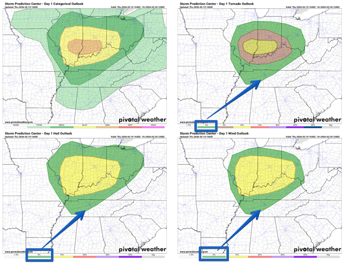 We have a 5% chance of damaging straight-line winds and/or hail, along with a 2% chance of a tornado within 25 miles.