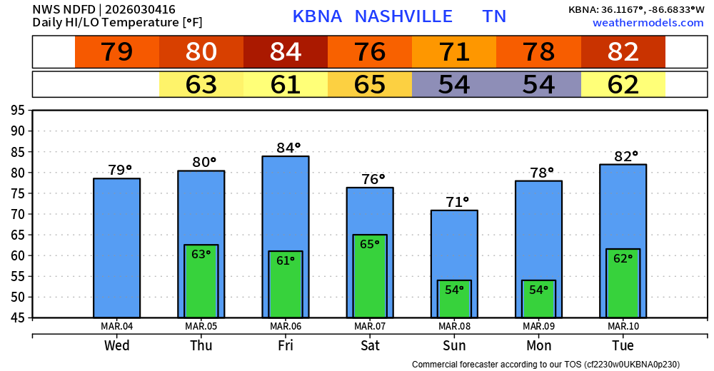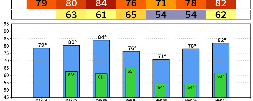 Wednesday –> Forecast = 80° | Record = 84° (1976)
