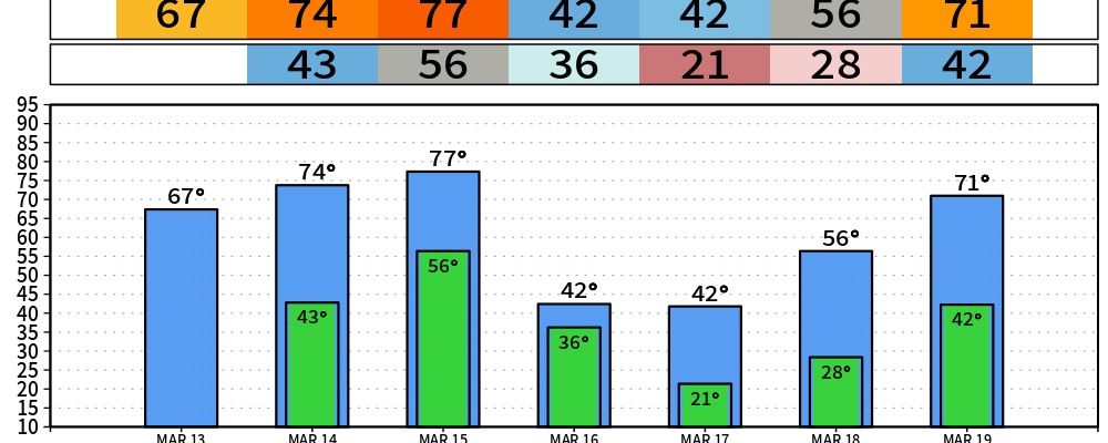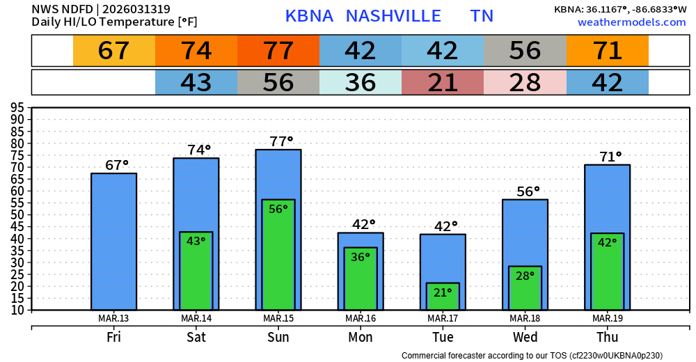 Temperatures will quickly drop after the passage of the cold front. Highs Monday and Tuesday will only get up to the mid 40s, with a hard freeze expected Monday night. We may even see a few flakes fly Monday, but no impacts/accumulation expected. If you have anything already planted, be sure to protect those.