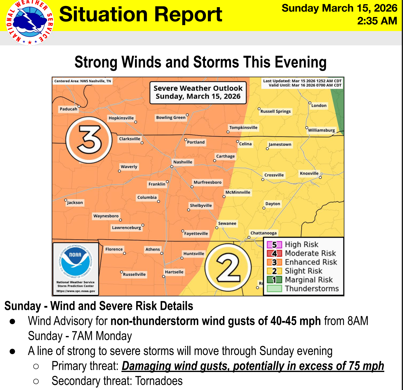 Severe wind threat has increased to 45% with straight line winds in excess of 75mph possible. This is enough to damage buildings and bring down trees. Especially trees already compromised by the ice strom.
