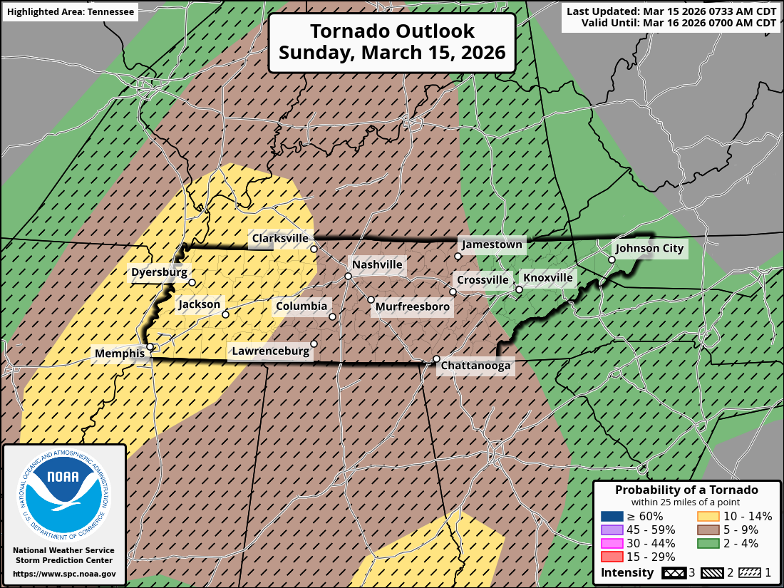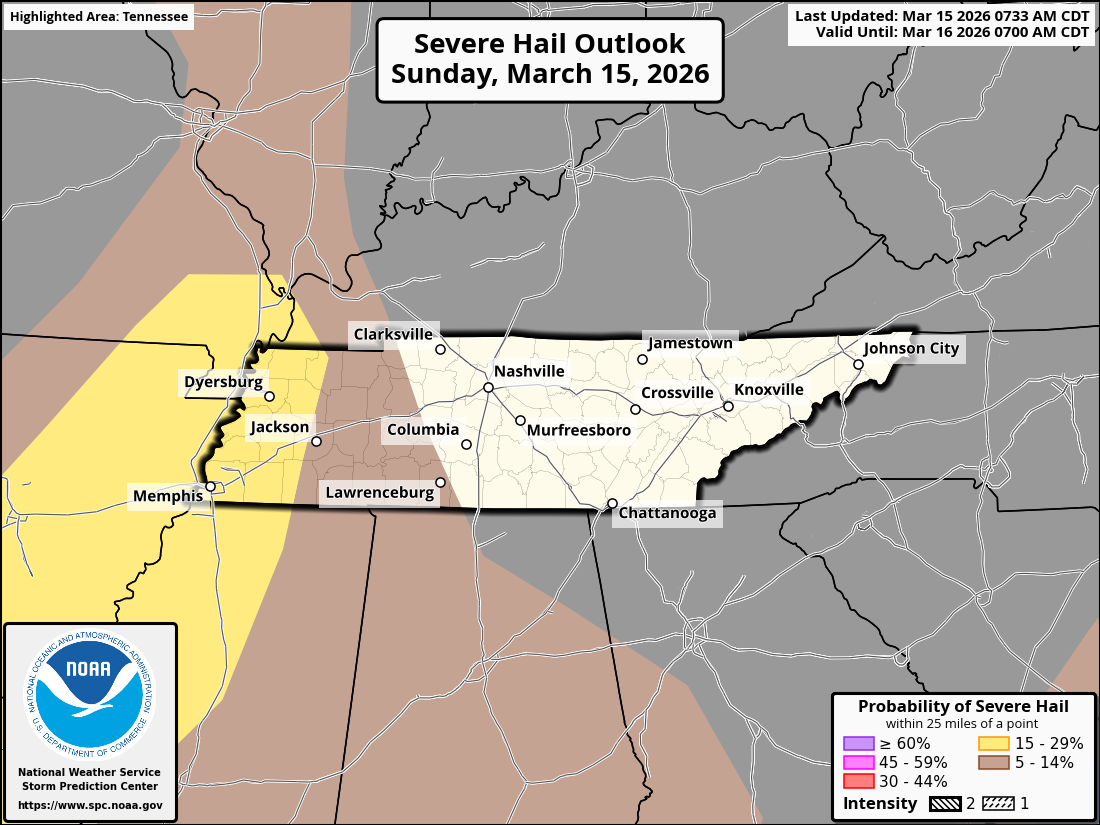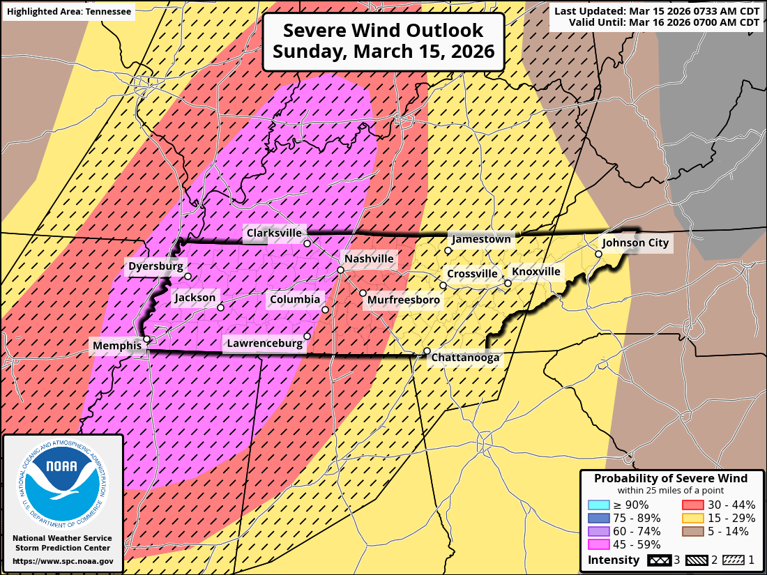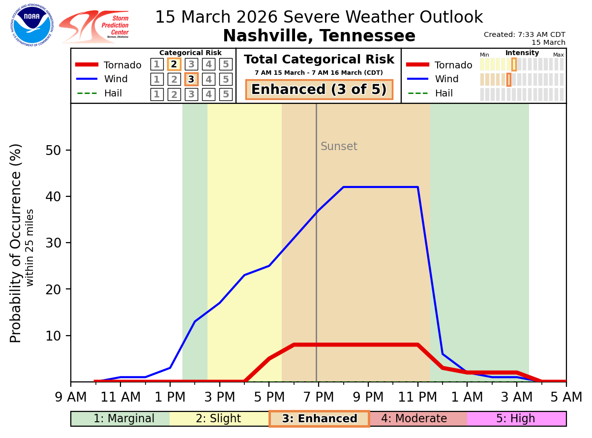 Timing… Right now, storms are expected to reach western Tennessee around sunset and then push east across middle Tennessee during the late evening. For the Nashville area, the most likely window looks to be roughly 9 – 11 PM, with storms moving quickly once they arrive.
