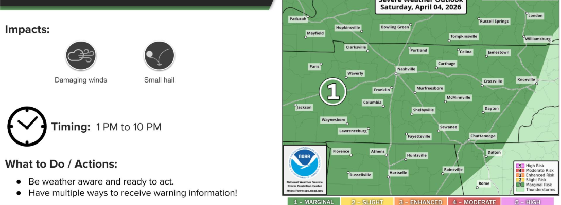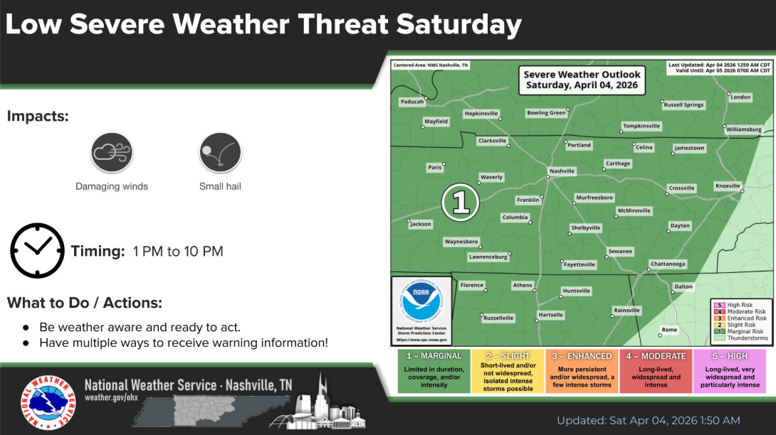 The only real change is that the Storm Prediction Center has introduced a 5% chance of damaging straight-line winds within 25 miles. No tornado concerns today.