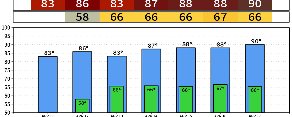 Temperatures will continue to slowly warm up as we get into next week, pushing 90° by the middle of next week. If that seems like it would be early for us to hit 90° – you’re right. Our average first 90° day isn’t until May 27. If we do hit the mark before April 17, it would be the second earliest on record (earliest is April 9, 2011).