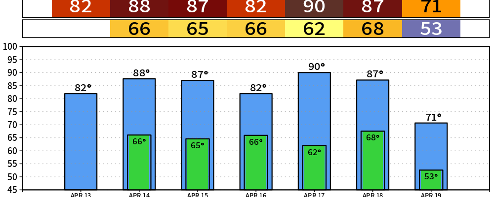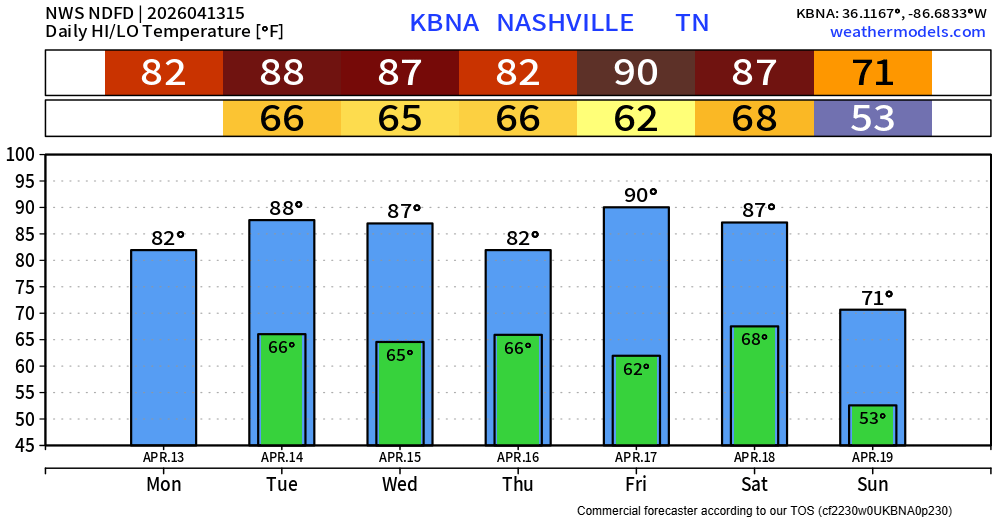 From Tuesday thru Saturday, with the exception of Thursday, we will threaten our daily record highs each day. Quite the stretch of abnormally warm temperatures. If we hit 90° on Friday, that would tie the second earliest date Nashville has reached that mark. Our average first 90° day is May 27.