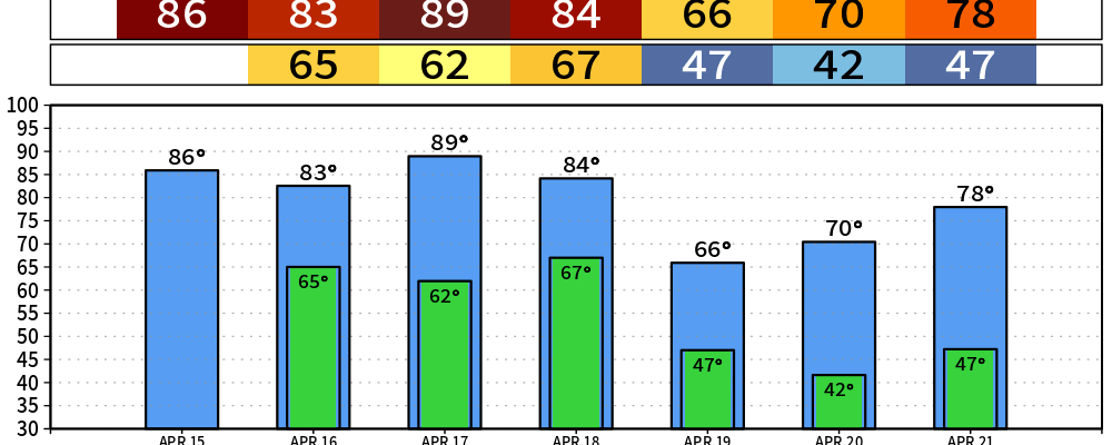 Our well above average temperatures will continue thru Saturday. Today and Friday will both have a run at the daily record high temperatures – 87° set in 1936 for today, 90° set in 1955 for Friday.