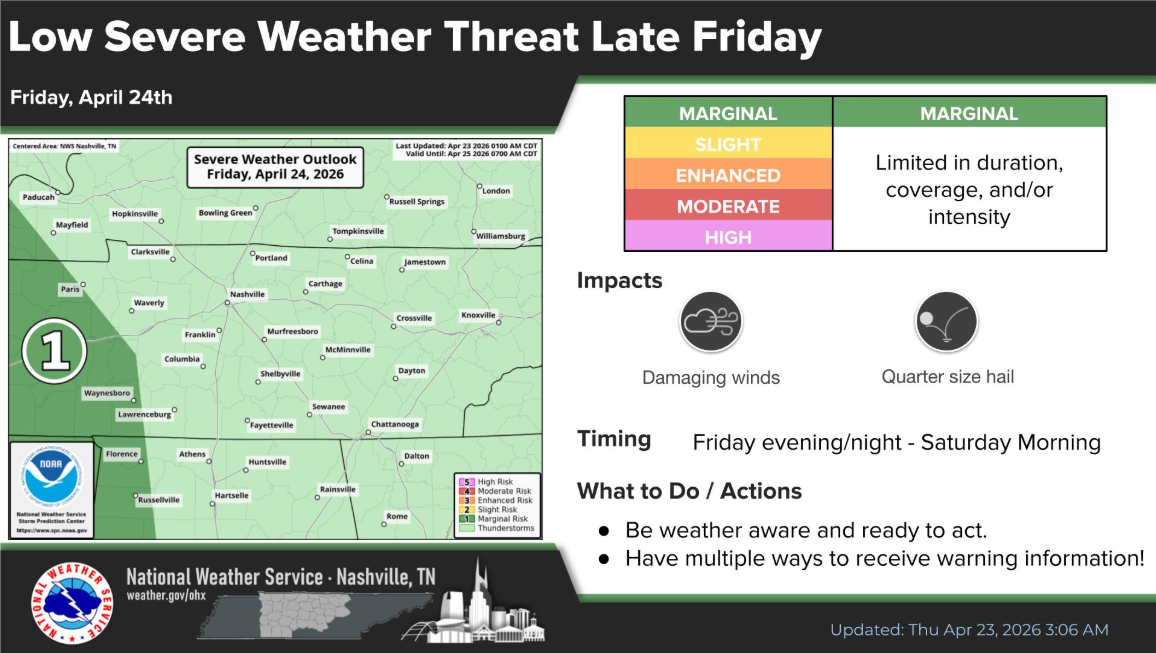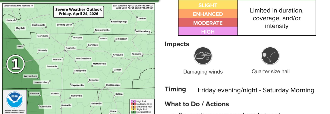 Our two counties continue to be outlooked with a 15% chance of severe weather within 25 miles.