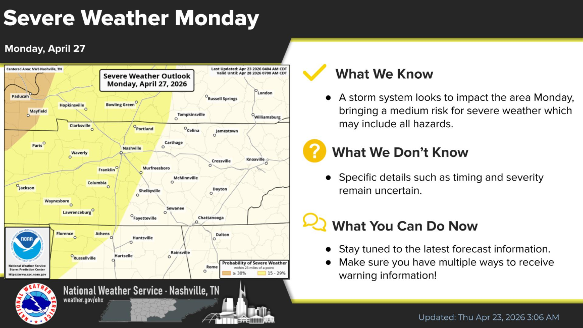 Bottom line: Severe weather is possible on Monday PM, stay connected as the forecast changes and new info comes in. For what it’s worth – the higher probabilities are to our northwest right now.