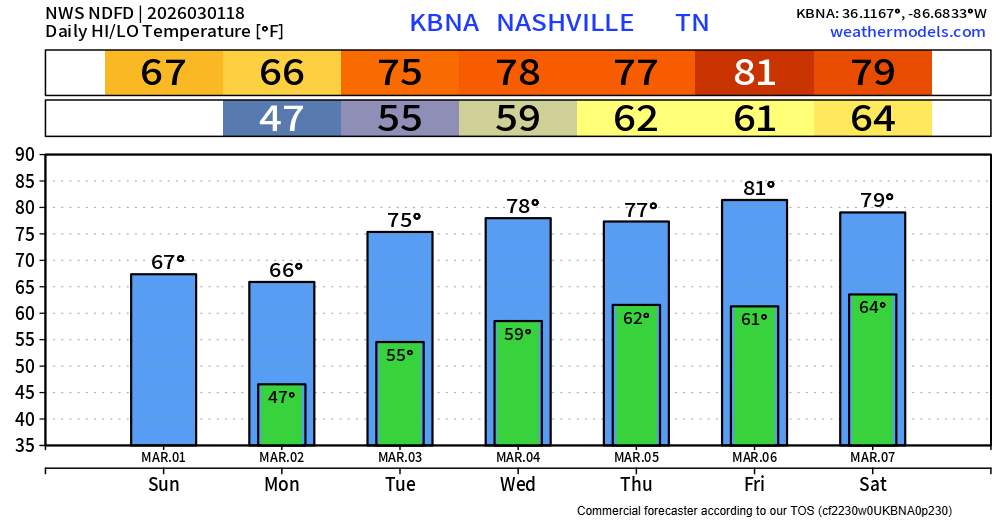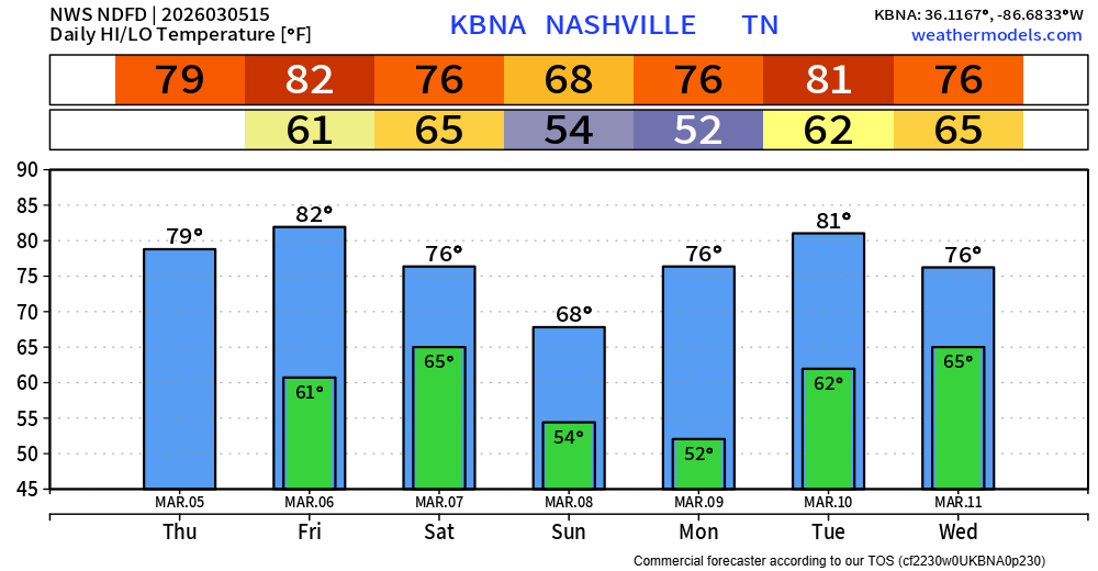 Our abnormally warm stretch of weather continues. Today (Thursday) and Friday both near 80°, which will threaten the daily high records. We “cool” down a bit on Sunday post-cold front, but warm right back up into the mid to upper 70s by early next week.