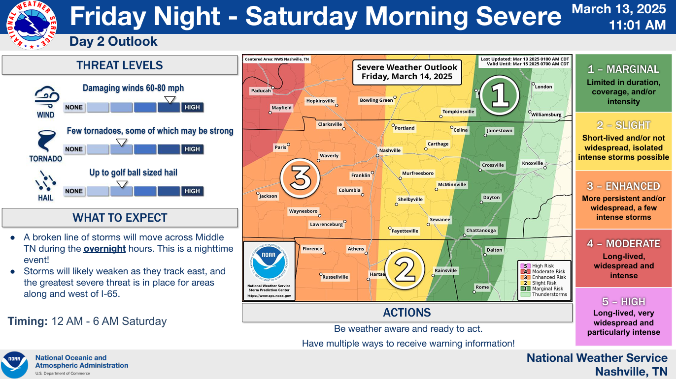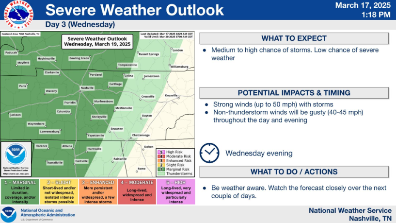 Similar temps for Wednesday, but with chances for some showers/storms as a cold front pushes thru sometime in the afternoon/evening. Before, the rain, wind gusts up to 40 – 45 mph will be possible throughout the day – a Wind Advisory may be needed.