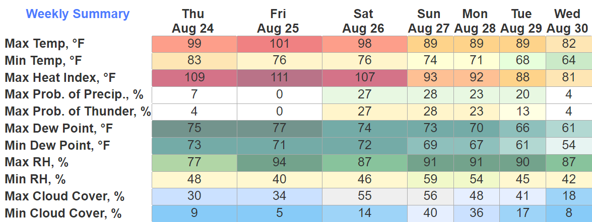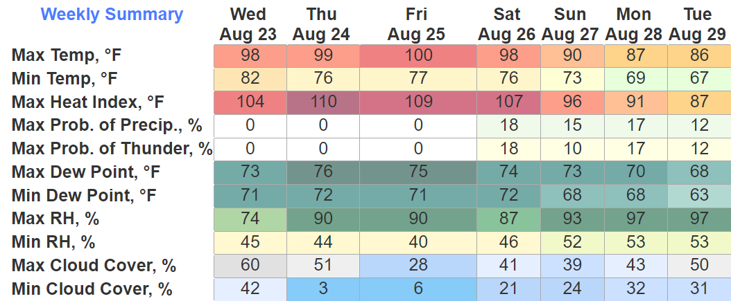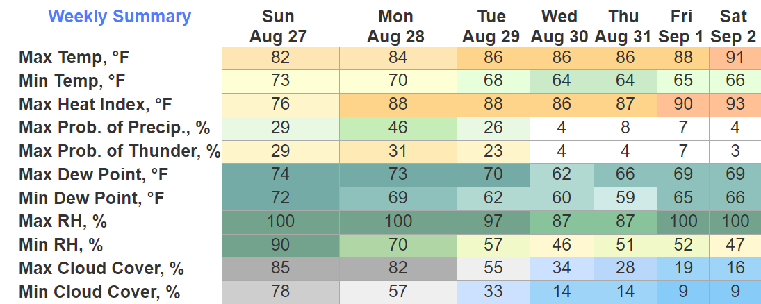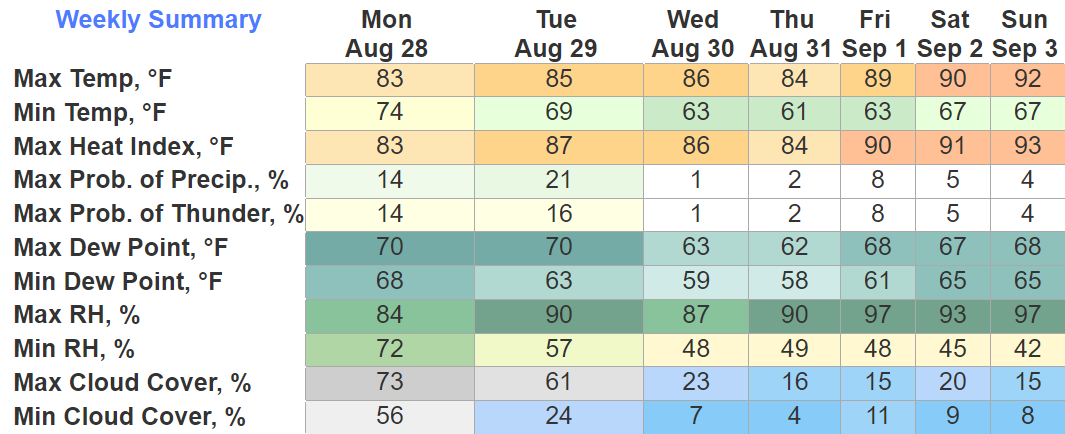 Rest of the week highs will be in the upper 80’s and low 90’s. Humidity will be no big deal, wonderful end to August.