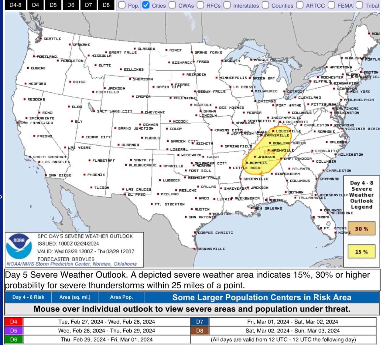 SPC outlooked Wednesday, Feb 28, 2024, for severe weather potential.