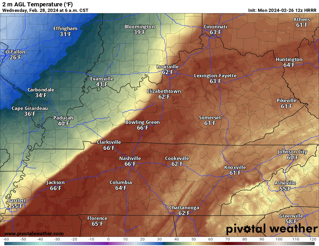 HRRR for 6:00 am Wednesday. Not hard to see the cold front. Temps will fall fast from the mid 60s to the low 40s once it passes during the morning hours.