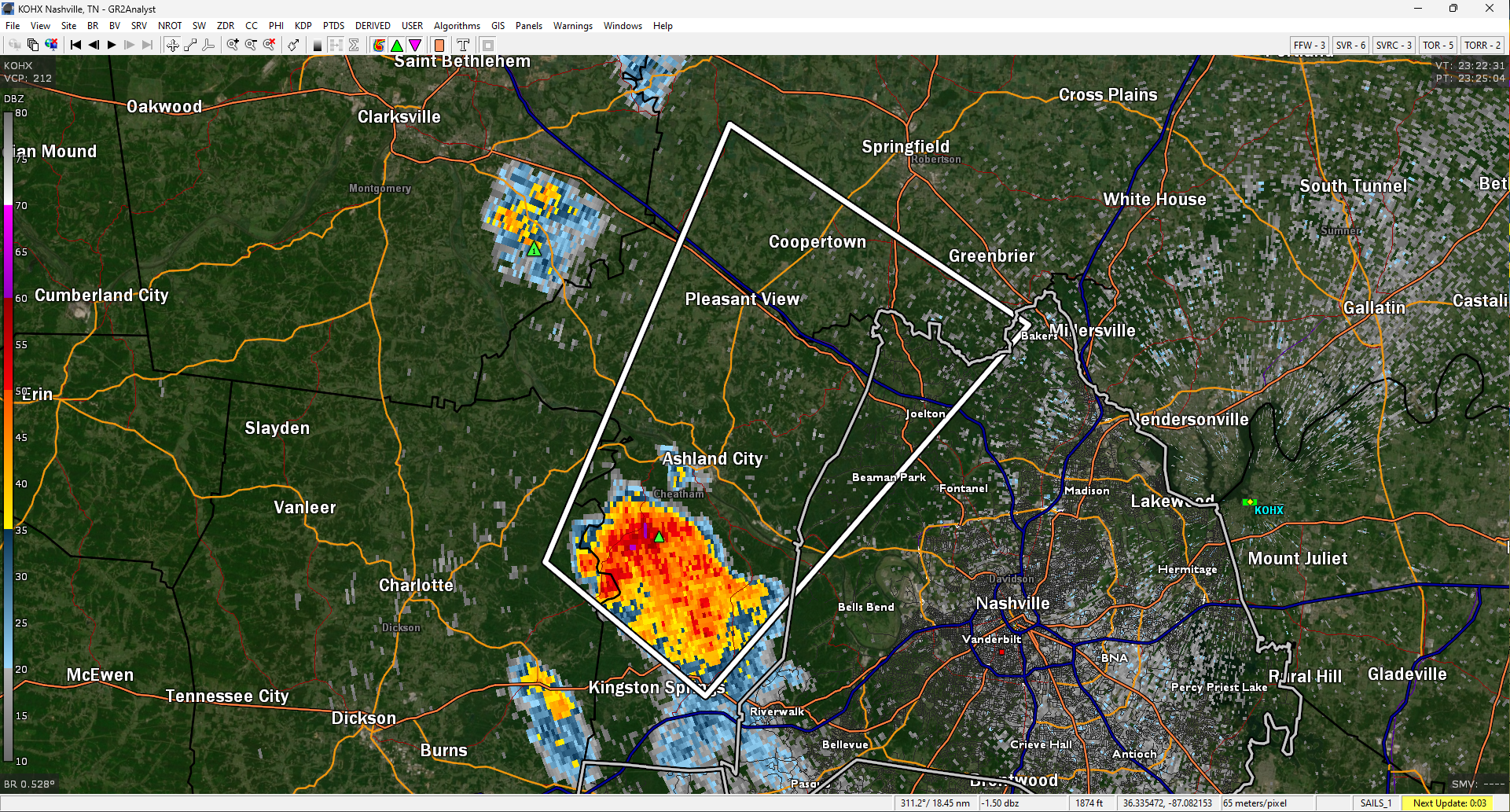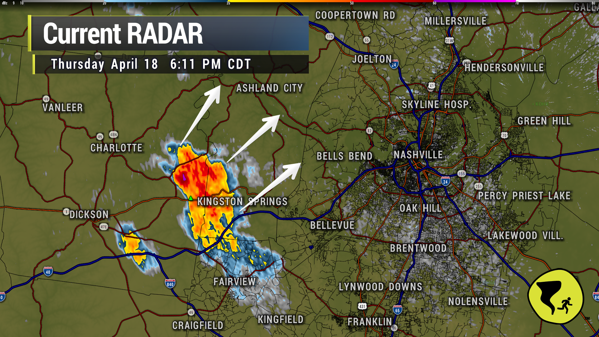 The winds aloft are trying to push this storm into Nashville, but there’s a carrot on a stick pulling the horse’s head toward the left as it follows a good lift source just ahead of the storm. So…the strongest part of the storm will stay near that lift source and tend to be on the north side. Should miss downtown Nashville. Might even miss Joelton. We’ll see. Lightning still an issue with this storm. 6:18 pm