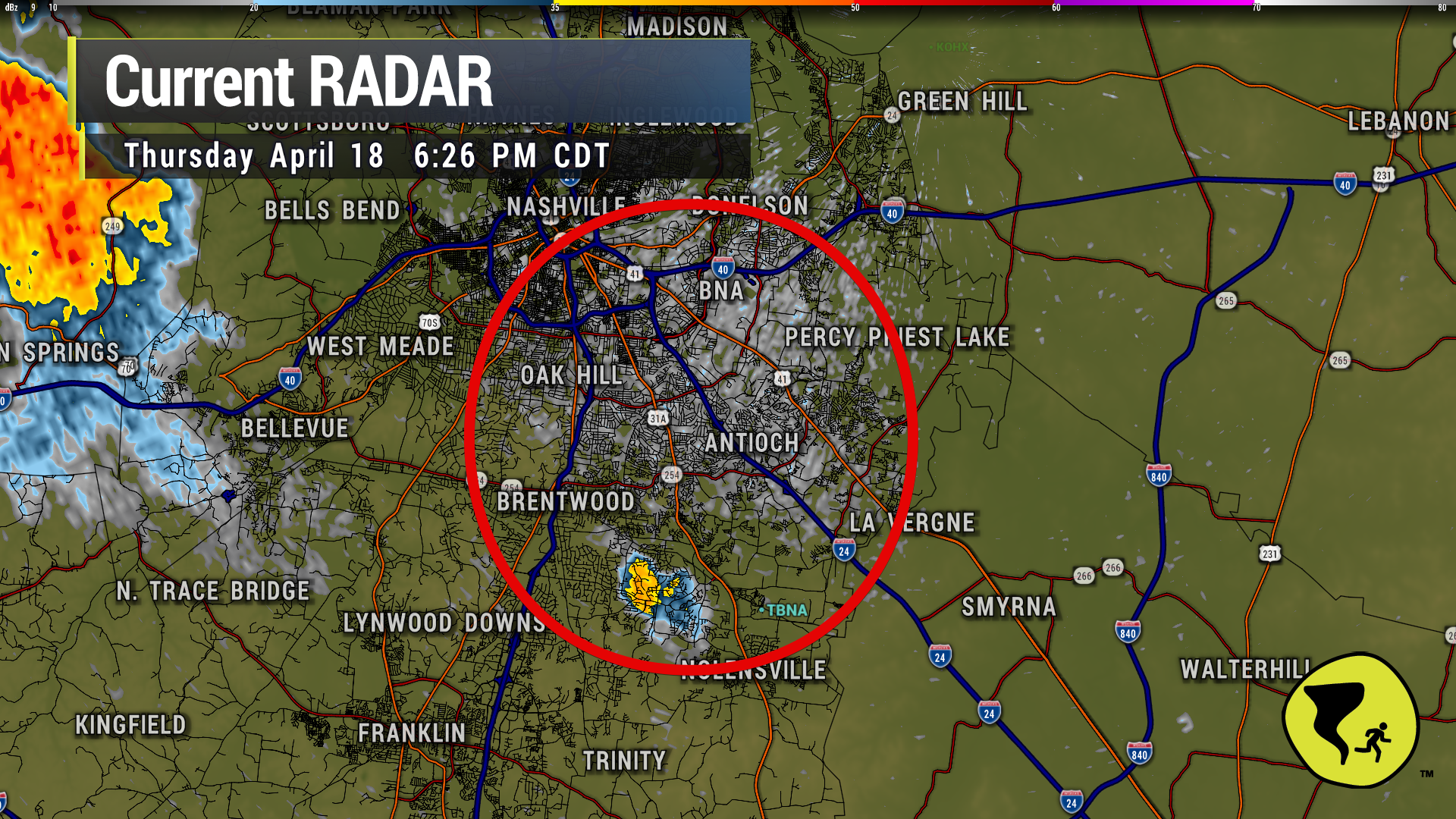 Storm has perked up entering western Williamson Co. Headed for Bellevue and perhaps Nashville W of 65 over the next hour….if it holds together. Lightning IS occurring. Head inside if you hear thunder. 5:39 pm