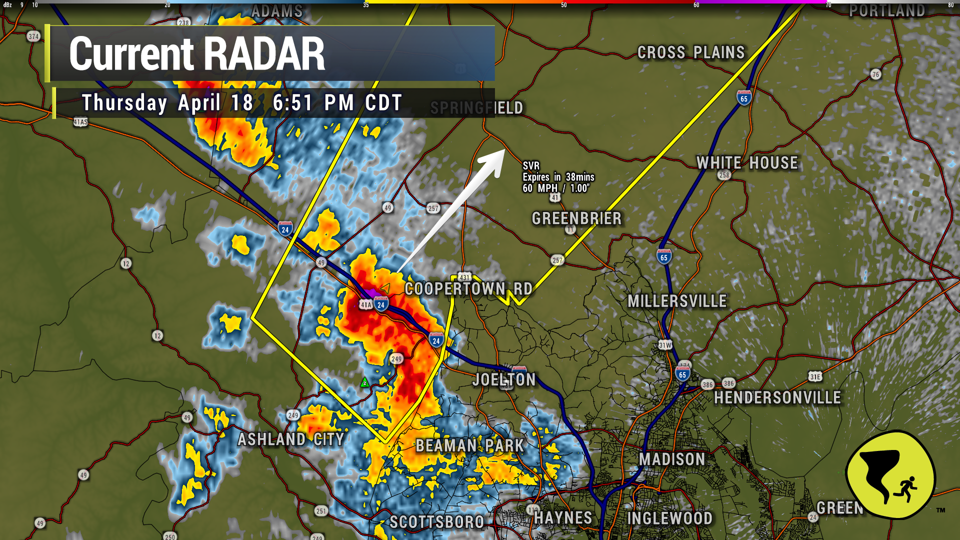40 mph winds and pea-size hail possible inside the white polygon (Joelton) if this cell holds together, per NWS.