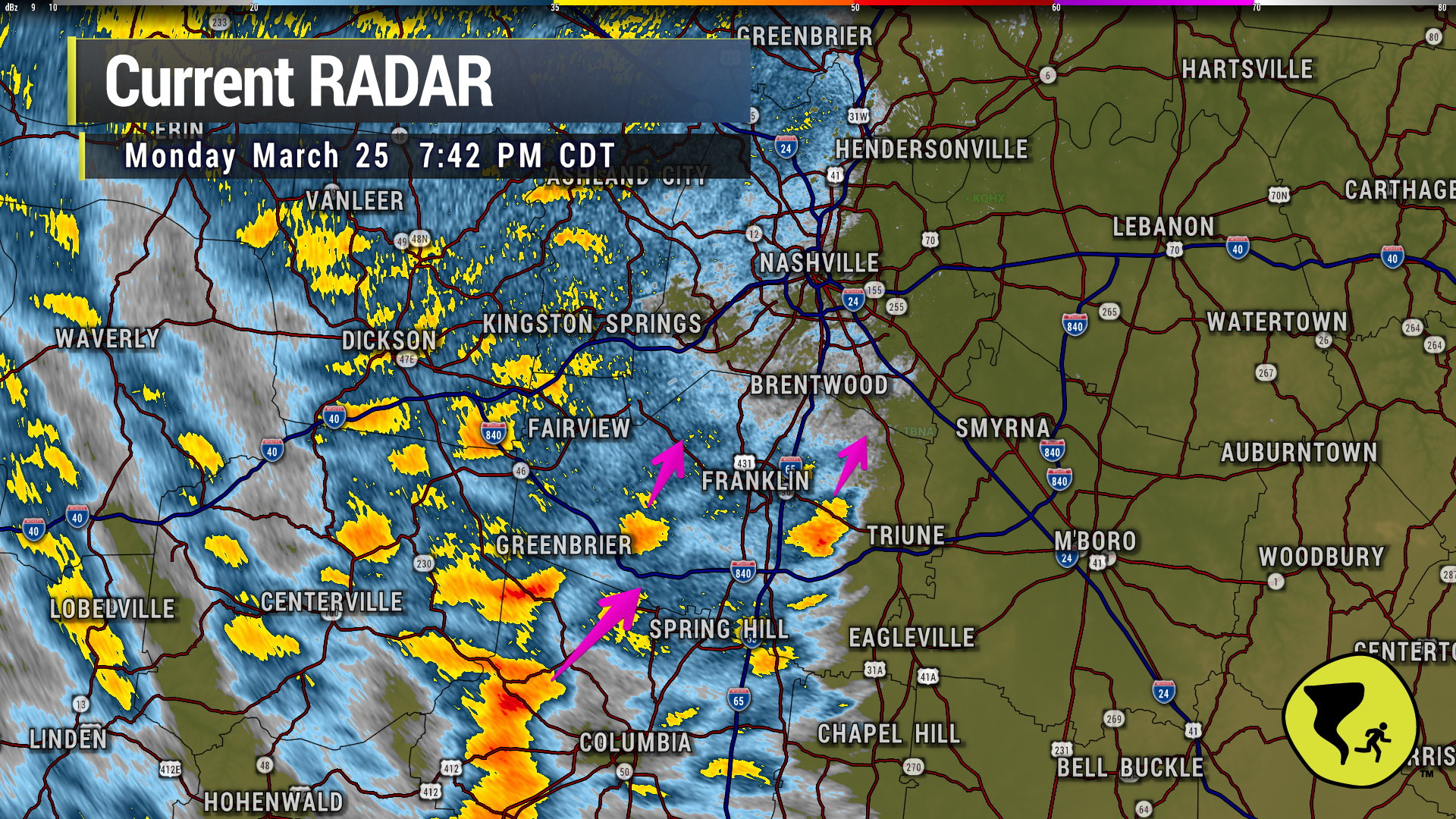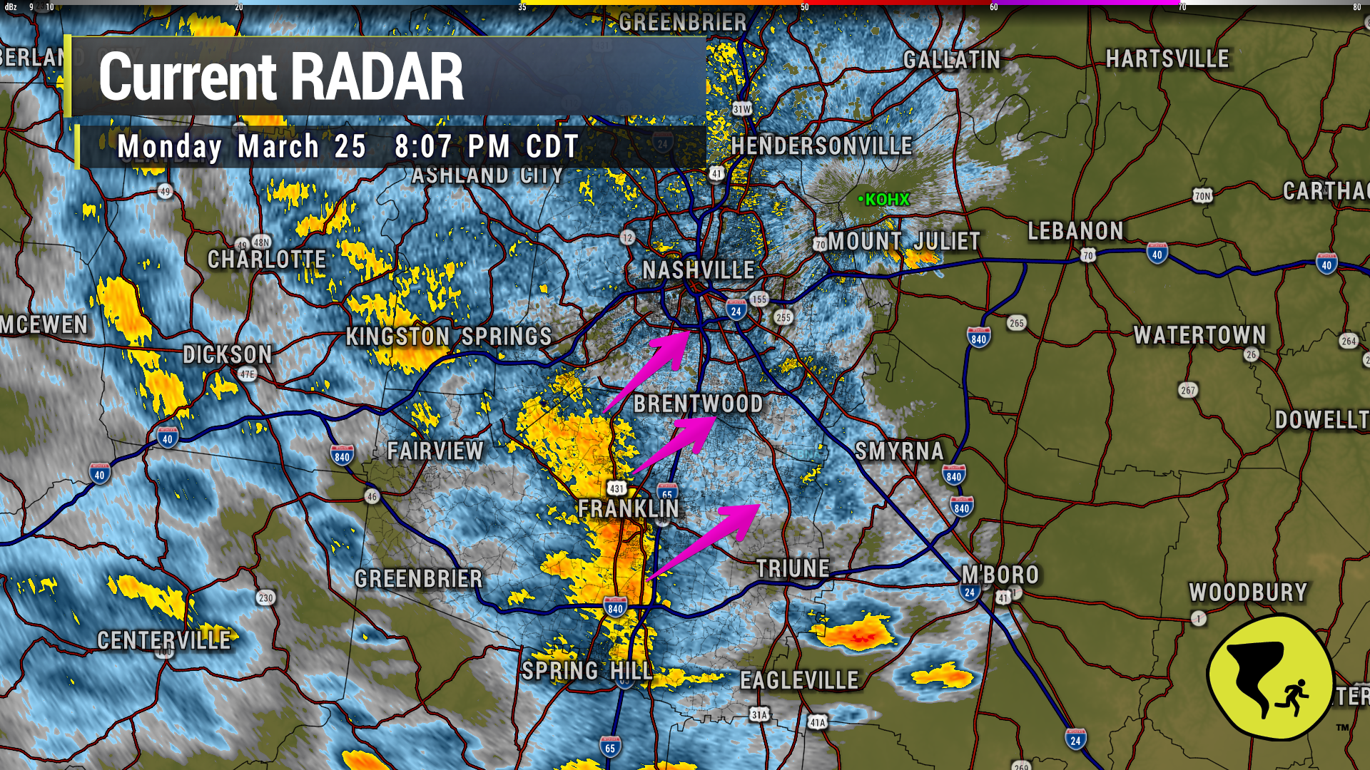 Couple of heavier downpours approaching Nolensville, Brentwood and W Franklin. Just a good ole regular thunderstorm. We like being able to say that. 7:42 pm