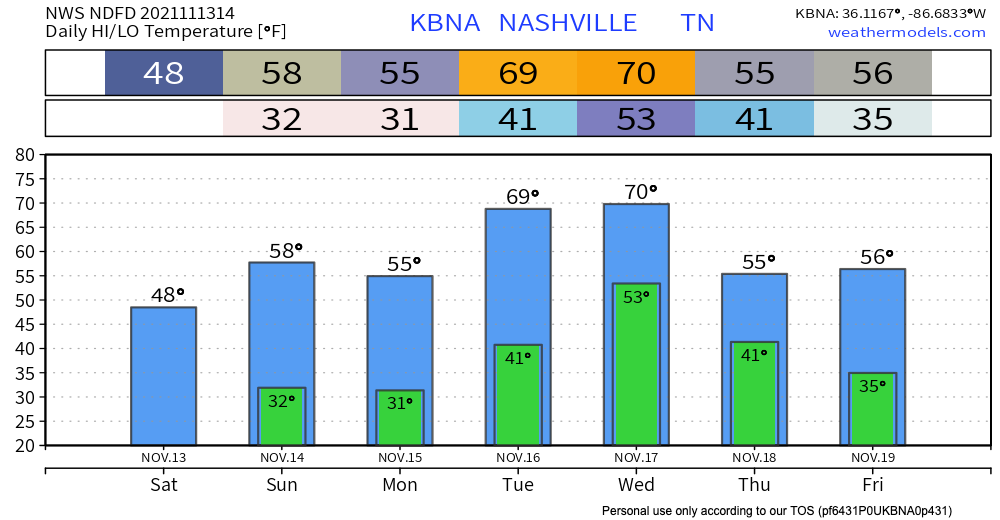 The HRRR below is showing no rain in Tennessee today. Skies will be mostly sunny with a high of 49 degrees. If you are going out today, it would be good to grab a jacket or coat.