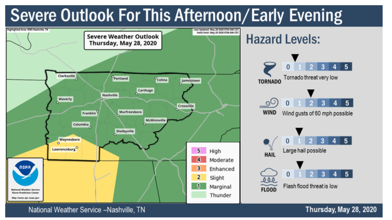 Few more clouds than Tuesday but rain chances still remain low. The HRRR model thinks rain and a few nonsevere storms will are possible on the fringes of Middle Tennessee, but nothing impacting us.