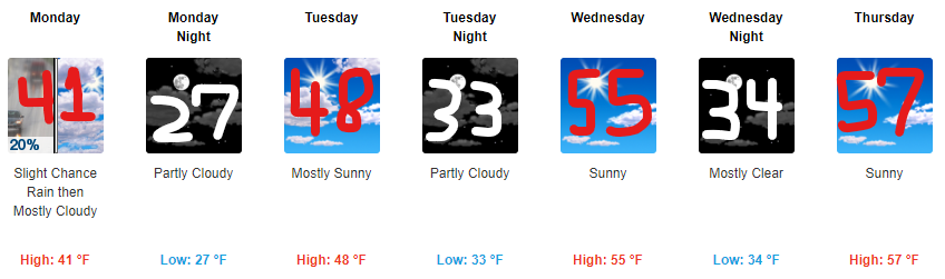 Temperatures just before sunrise Monday will reach 37°, in the afternoon warming up to 63°.