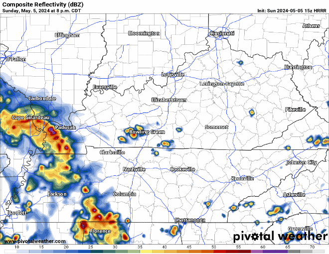Storms forming near Memphis may arrive here this afternoon. Not everyone will see a storm. Those that do will want to be inside. We are not severe-outlooked by SPC; however, our local NWS office notes enough instability and shear to power storms up. This is suggested by the HRRR model below. Storms may be strong, maybe severe, with damaging straight line winds the main severe feature. Data does not support tornado. Hail, if any, will be small. Heavy rainfall running above already saturated grounds may create temporary, localized, but real flooding in the “usual spots.” We’ll be covering this on Twitter/X today. On YouTube Live if any warnings are issued. Activity should end after dark.